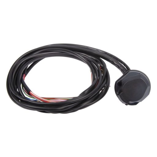 Egyszerű, univerzális, 13-pólusú kábelköteg vonóhoroghoz. A kábelköteg hossza 190 cm. A csomagolás tartalma: -dugalj hátsó kivezetéssel, gumi alátét, szerelési rajz - kábelköteg hossza 190 cm, színes erek, szemes testkábel, a +os erek 2,5mm-esek - csavarok, csatlakozók, nincs biztosítéka