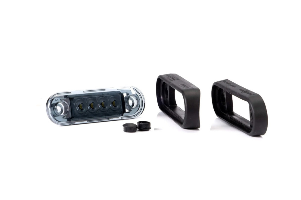 Leírás: Ez a népszerű LED helyzetjelző lámpa kompakt méretben DARK kivitelben kisteherautókhoz és teherautókhoz. A sötétített felső burkolattal, elegáns és modern megjelenésű, de ez a módosítás nem befolyásolja a fényerőt. A lámpa az autó karosszériájának formáját másoló műanyag házba került, és a csavarokat burkolatokkal is ellátták, amelyek biztosítják a csavarok nélküli sima megjelenést. Három színkombinációban, fehér, piros és narancssárga változatban. Négy kiváló minőségű dióda nagyon fényesen világít, a fénysugár szükségtelen szétszóródása nélkül. Ellenálló, ütésálló műanyag, alacsony fogyasztás, mindössze 0,05 A