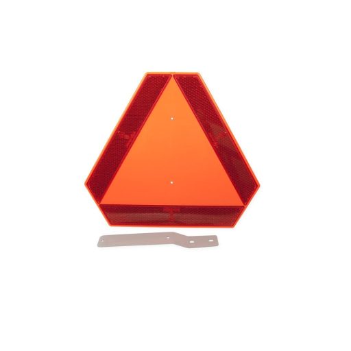 Jelzőtábla, fényvisszaverő háromszög lassú járművekre – mezőgazdasági gépekre, építőipari járművekre. Méretei 43 x 38 cm, beleértve a fém rögzítőfüleket és a csavarokat, tartó nélkül.