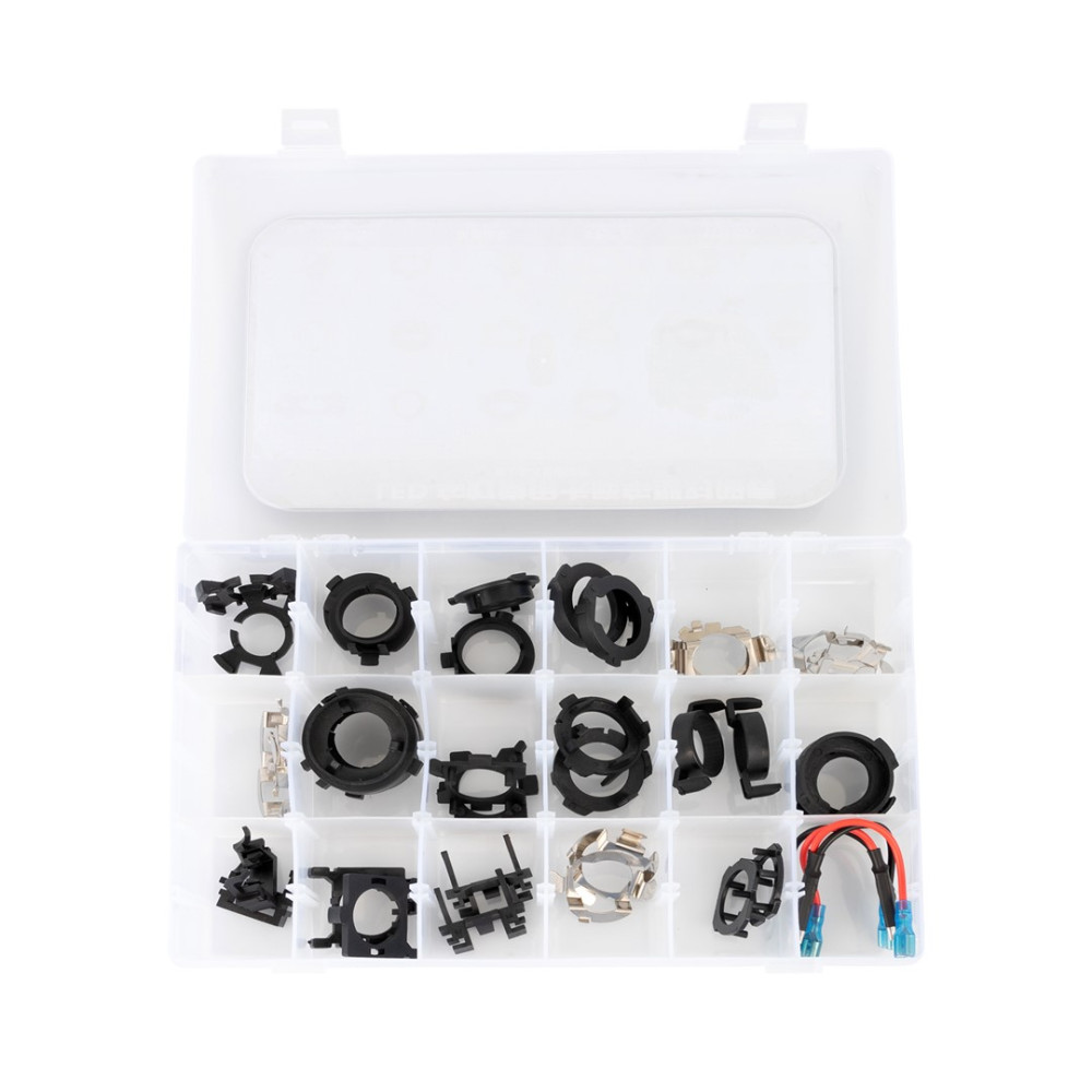 18 féle adapterből álló készlet, amely megkönnyíti a LED-készletek beszerelését olyan autókba, amelyekben szokatlan izzórögzítésű fényszórók vannak.