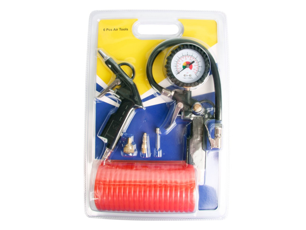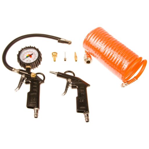 Szett 3 az1-ben 2db kompresszor pistoly (manométeres felfujó és levegő fúvó), spirál cső/tömlő- 5m-es