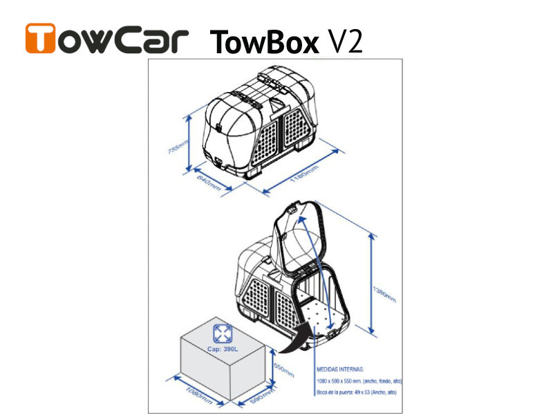 A TowBox egy többfunkciós termék, amelyet csomagok, kerékpárok, babakocsik stb. szállítására terveztek. Létezik kutyák és más háziállatok szállítására alkalmas változat is. -A TowBox V2 390 liter plusz csomagteret kínál egy olyan műanyag héjban, amely minden típusú rakományhoz alkalmas anyagból készült. -A vízelvezető lyukaknak és a karbantartásmentes műanyagoknak köszönhetően nem kell aggódnia a szennyeződések vagy nedves tárgyak miatt, az egész belső tér könnyen mosható! -A közepes sűrűségű polietilén (PE-MD) használata rendkívül magas ütés-, csavarás- és korrózióállóságot biztosít. -A vonóhorogra szerelt doboz nem befolyásolja a jármű aerodinamikáját, így üzemanyagot takarít meg, és megszűnik a kellemetlen zaj nagyobb sebességnél. Ráadásul nem korlátozza a jármű sebességét! -A megrakott doboz kényelmesen felszerelhető / eltávolítható, összecsukható kerekekkel van felszerelve a házhoz, üzlethez, szállodához, vízhez stb. történő könnyű szállításhoz. -A doboz két zárral van felszerelve a doboz és a rakomány biztosítására, valamint két lakatnyílással. -Minden kéznél van - a doboz fedele mindkét oldalról nyitható, így könnyen hozzáférhet a rakományhoz, a slide+fold rendszer pedig könnyű hozzáférést biztosít a csomagtartóhoz.