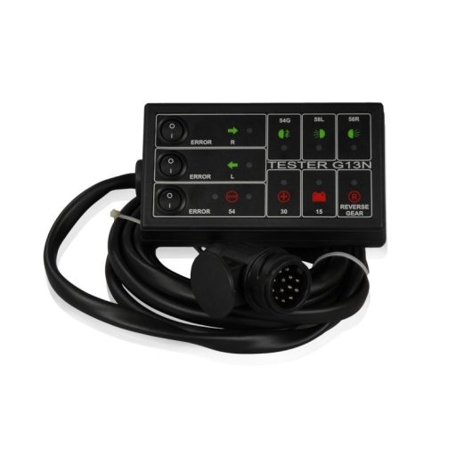 Ez a LED-es vizsgáló készülék az összes közlekedési szempontból fontos világítási funkciót vizsgálja az utánfutó csatlakozó aljzatainál és dugóknál. A LED-es kijelző az adott hibás kábelszínt jelzi. Az összes 7-13 pólusú csatlakozó aljzatot és dugót megvizsgálja. 5 m kábel. Kiégett izzó szimuláció.